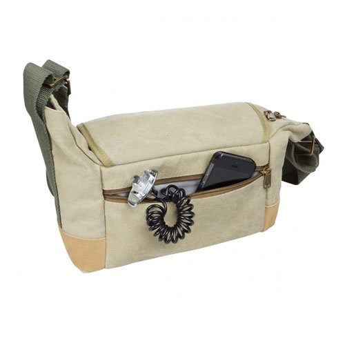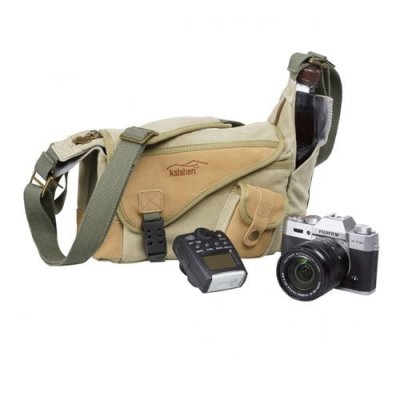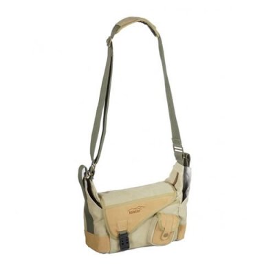 Menší brašna na foto techniku v khaki barvě. Brašna je vybavena množstvím malých kapsiček na nejrůznější příslušenství a její vnitřní rozměry jsou 22 x 14 x 9 cm. Součástí brašny je i odnímatelný textilní popruh.