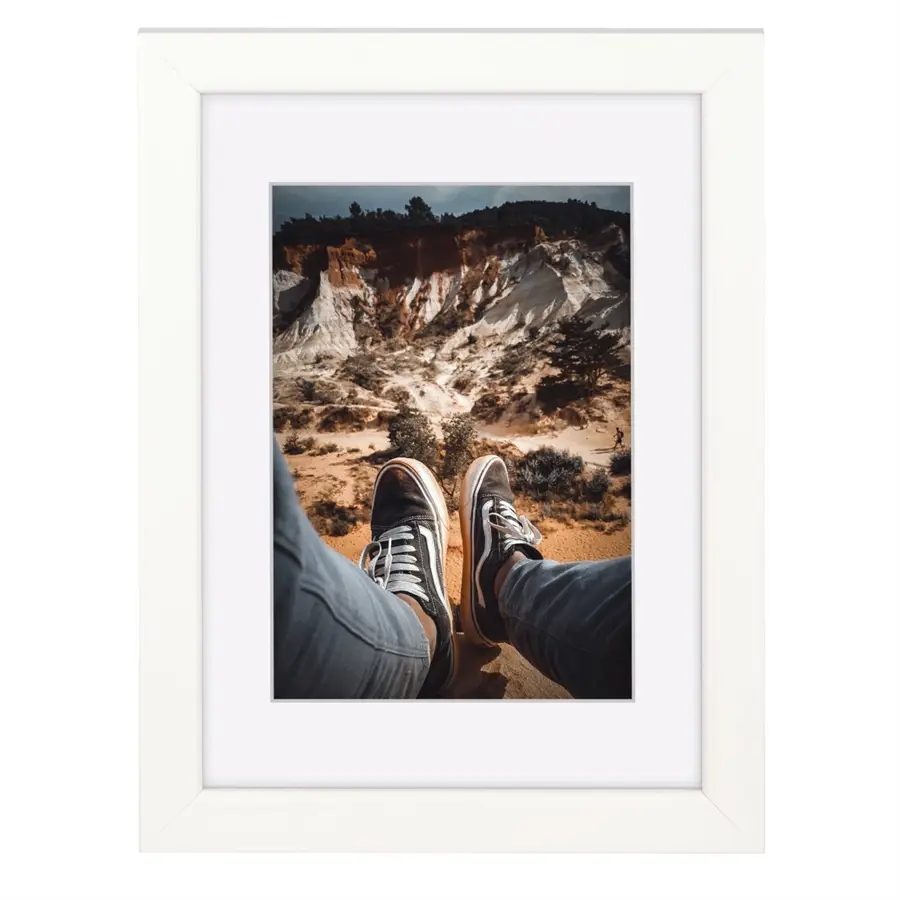Dřevěný rámeček bílé barvy pro fotografii ve formátu A4, tedy velikosti 21 x 29.7 cm. Rámeček lze pověsit na zeď, nebo jej postavit na stůl a to jak na výšku, tak na šířku.