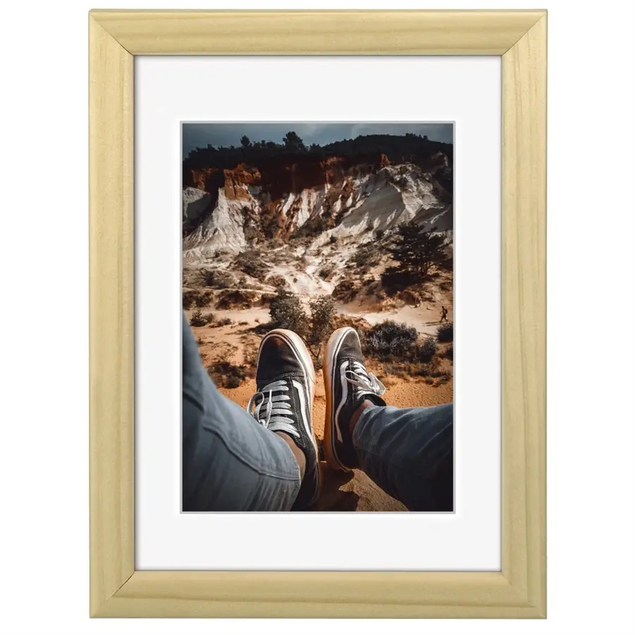 Dřevěný rámeček barvy světlého dřeva pro fotografii ve formátu A4, tedy velikosti 21 x 29.7 cm. Rámeček lze pověsit na zeď, nebo jej postavit na stůl a to jak na výšku, tak na šířku.