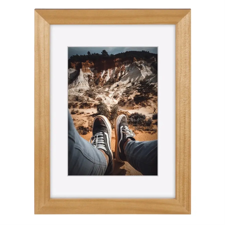 Dřevěný rámeček korkové barvy pro fotografii ve formátu A4, tedy velikosti 21 x 29.7 cm. Rámeček lze pověsit na zeď, nebo jej postavit na stůl a to jak na výšku, tak na šířku.