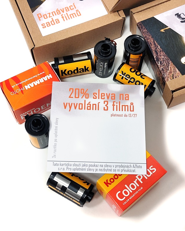V elegantním dárkovém balení najdete tři různé kinofilmy (36 snímků každý) a navíc poukaz na vyvolání filmů u nás se slevou 20 %. Díky tomu si můžete filmy nejen vyzkoušet, ale rovnou je i výhodně zpracovat.